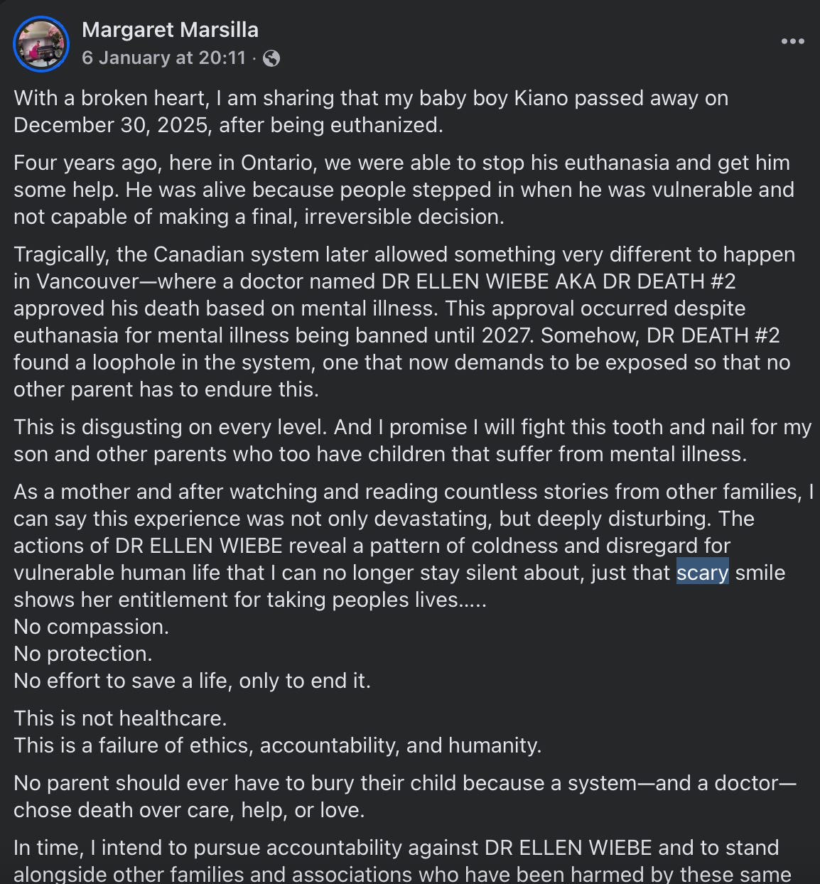 As a mother and after watching and reading countless stories from other families, I can say this experience was not only devastating, but deeply disturbing. The actions of DR ELLEN WIEBE reveal a pattern of coldness and disregard for vulnerable human life that I can no longer stay silent about, just that scary smile shows her entitlement for taking peoples lives…..