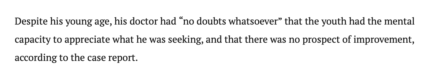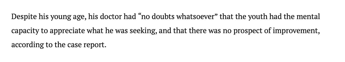 This is a total social execution, the system and world gave up on this kid. He wasn’t dying; he was lonely, so lonely he would rather die. He was struggling to navigate a world that is increasingly cold and fragmented and instead of building a bridge for him, the medical establishment gave him a needle. This kid needed support, friends and a family to pull him out of this hell he was stuck in alone. What’s worse is Dr’s are telling kids with Autism and skyrocketing rates of depression that they are terminal and won’t ever get better. This is a form of disgusting manipulation and despair.