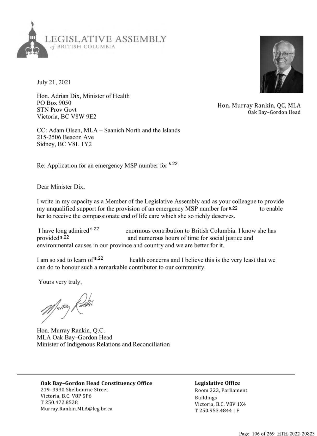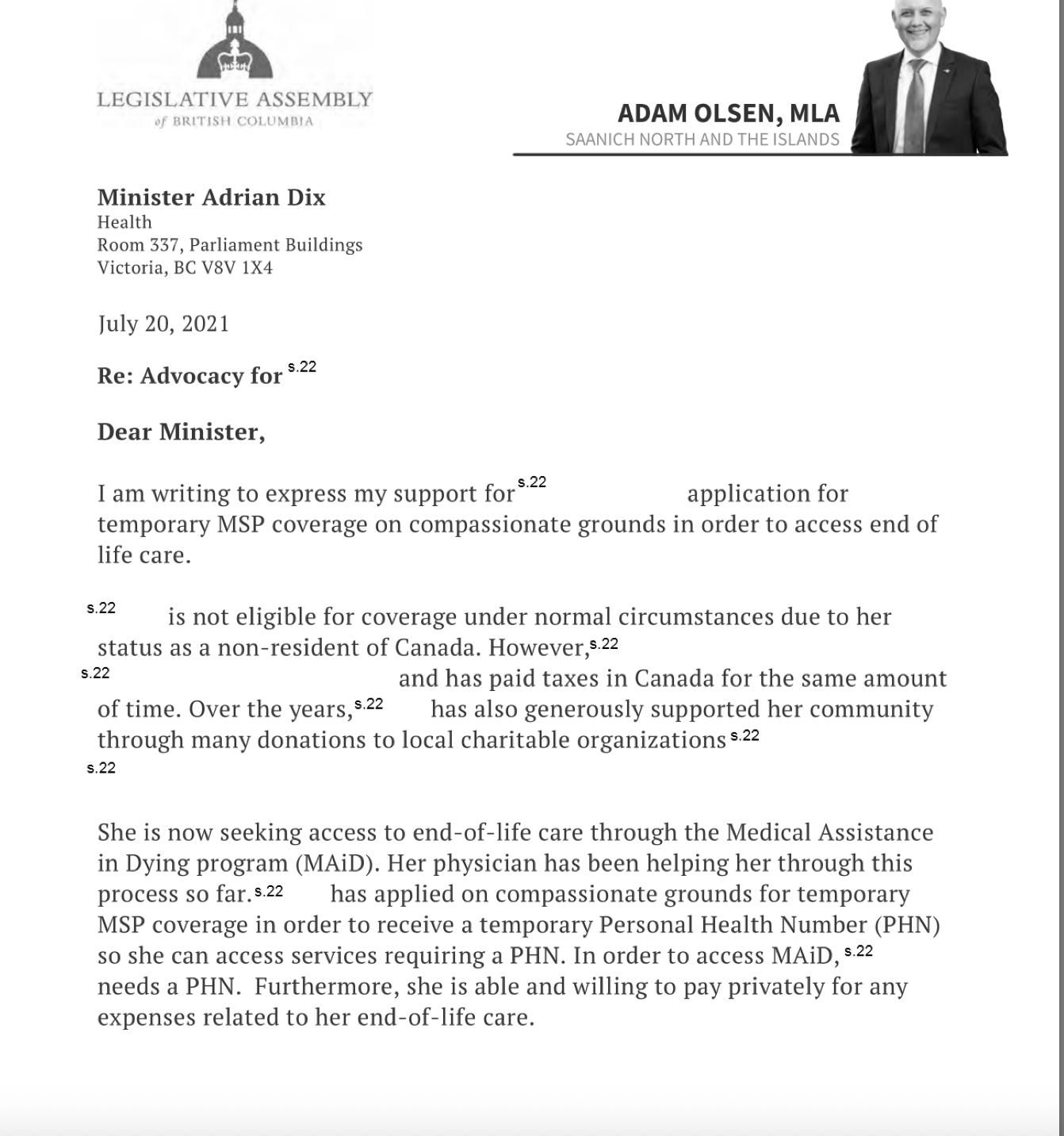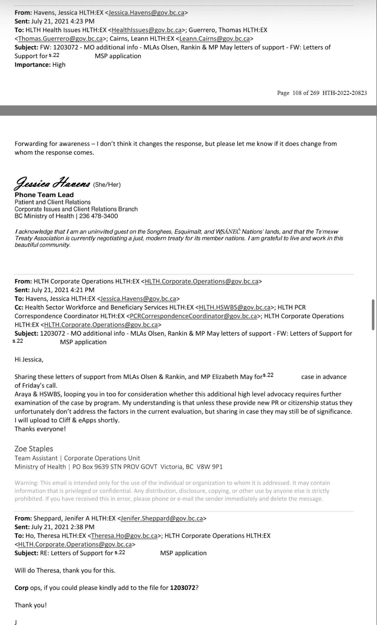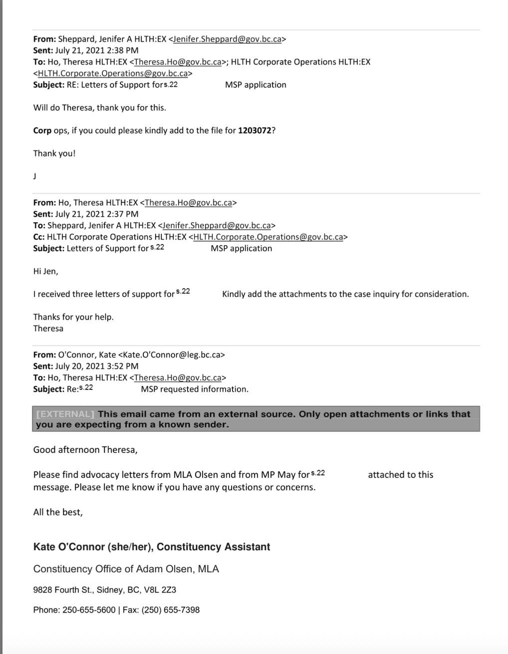 His letter expresses “unqualified support” for granting an emergency MSP number to the applicant. He knew she was not a resident, not eligible, not covered — and still pushed the Health Minister to make it happen. The purpose is self-evident from the internal emails: