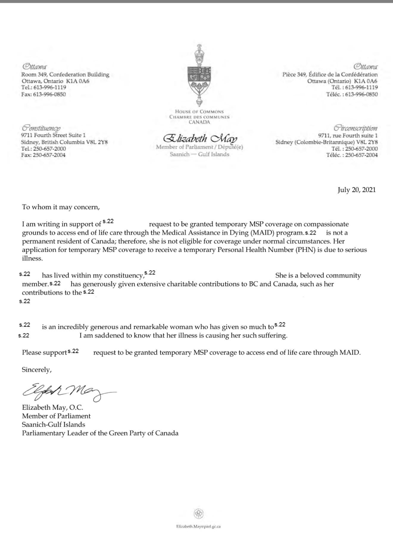 Elizabeth May: The Sitting MP Who Still Holds Power. May is the only one still in elected office. Her letter acknowledges the applicant is not a permanent resident, not eligible for MSP, and would not qualify under normal circumstances.